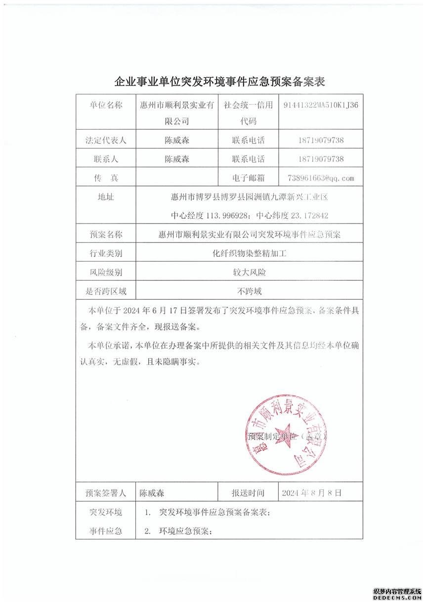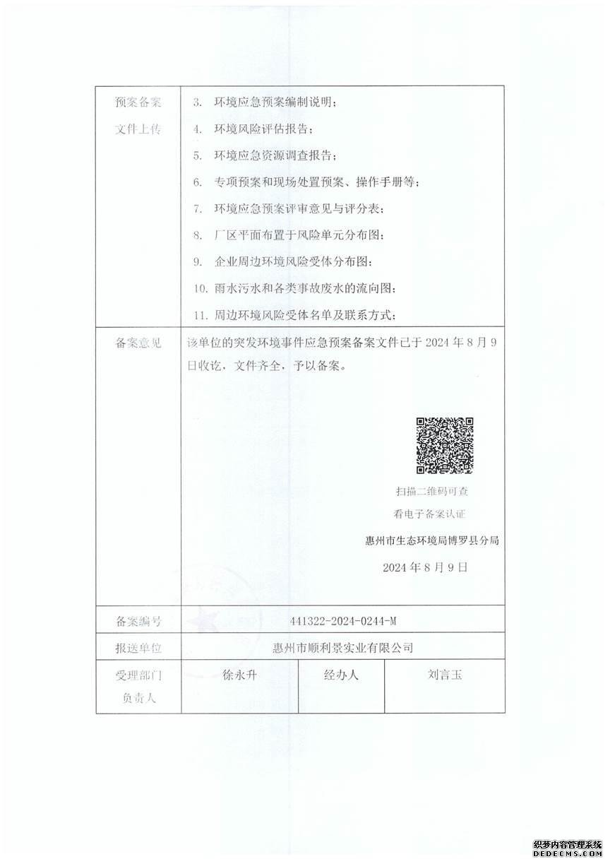 突發(fā)環(huán)境事件應急預案    已制訂《惠州市順利景實業(yè)有限公司突發(fā)環(huán)境事件應急預案》,并于2024年 8月9日在博羅縣環(huán)境保護局備案,